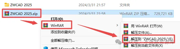 1.选中下载的压缩包,然后鼠标右键选择解压到“ZWCAD 2025”(没有解压选项点这里)