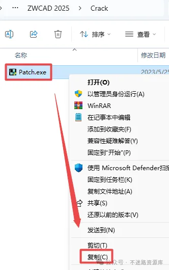 7.返回之前解压的“ZWCAD 2025”文件夹,双击打开“Crack”文件夹,选中“Patch.exe”文件,鼠标右键选择“复制”