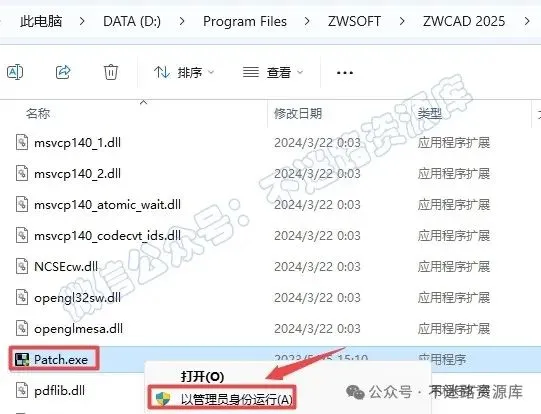 2.打开刚刚解压的文件夹,鼠标右键点击“ZWCAD_2025_Chs_Win_64bit_20240326.exe”选择“以管理员身份运行”、