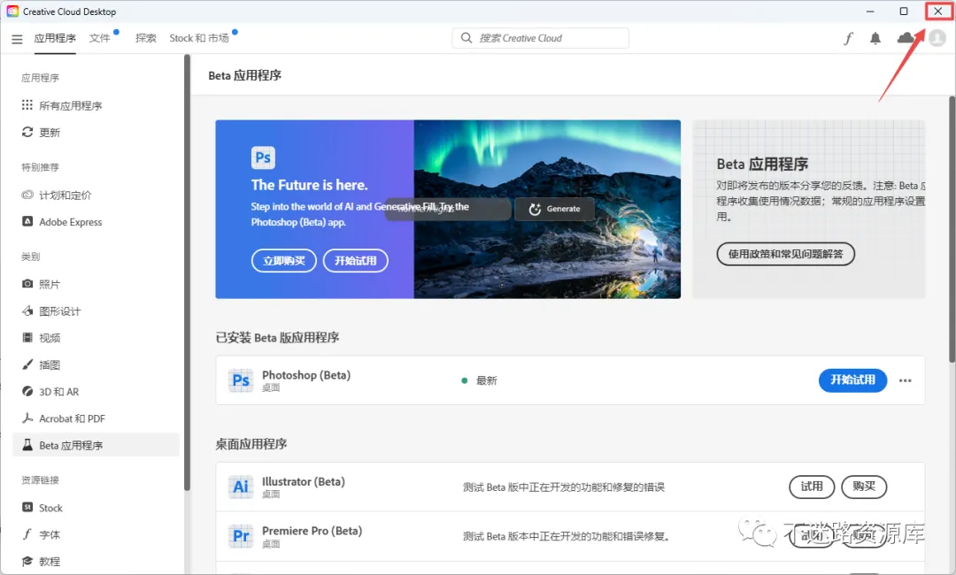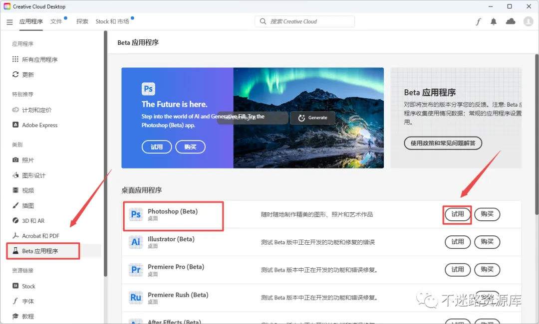 8.安装完成后,点击“Beat应用程序”找到Photoshop(Beta),点击“试用”安装