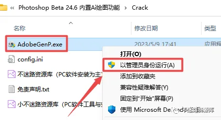 10.返回之前解压的“Photoshop Beta 24.6 内置Ai绘图功能”文件夹,双击打开“Crack”文件夹,找到并选中“AdobeGenP.exe”文件,鼠标右键选择“以管理员身份运行”