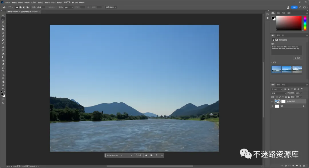 使用这一功能进行简单的创作,首先新建一个空白的画布,框选后输入:On the other side of the river, there are mountains and water, and it’s a sunny day(在河的另一边,有山有水,天气晴朗),稍等片刻,一幅图就生成了。
