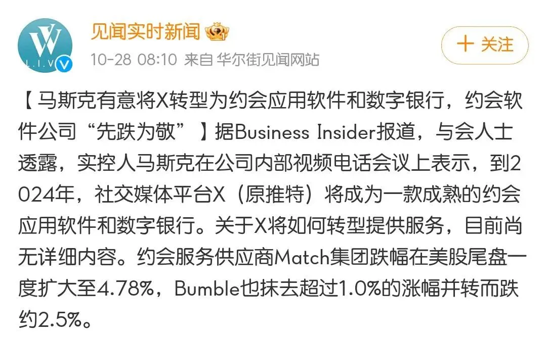 结果就在近日,据知情人士表示:马斯克在一次公司内部的视频会议上说,他打算在2024年把X(推特)打造成一个约会网站和数字银行。