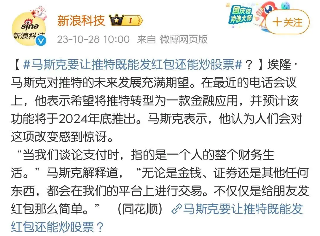 而前些日子提到的推特音频和视频通话功能,都只是单纯的社交属性,更离谱的是有媒体报道,马斯克要让推特既能发红包还能炒股票。