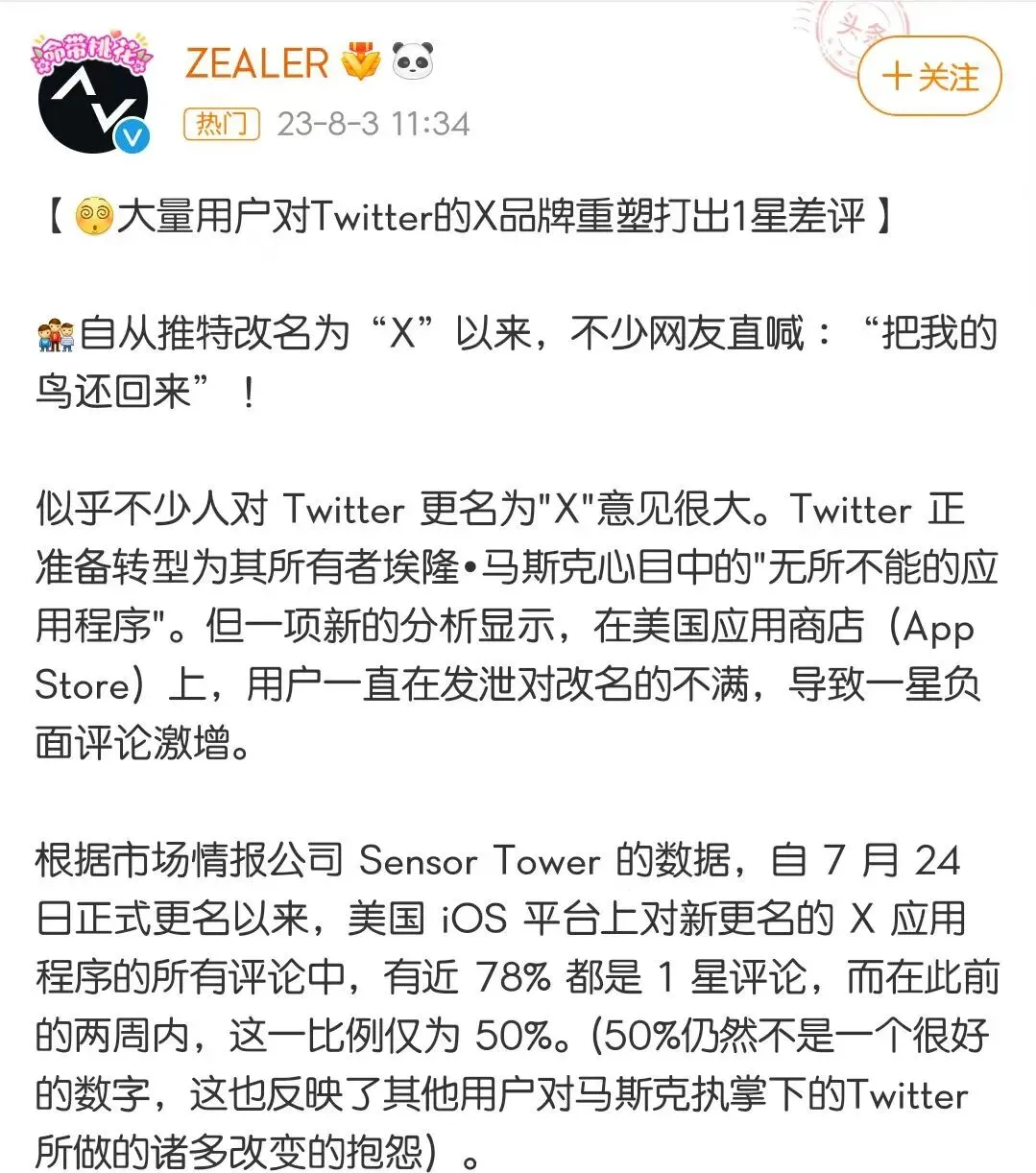 但其实在马斯克刚接手推特并将其改名为“X”的时候,就有很多推特原先的用户在App Store上对“X”打出1星差评,表示不满意、不理解。