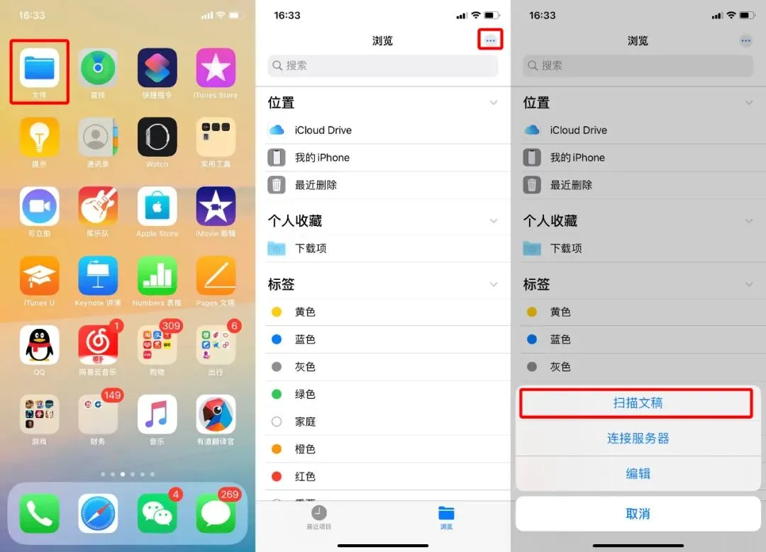 点击「文件」,在「浏览」标签页中,点击屏幕右上角的「…」按钮,选择「扫描文档」;