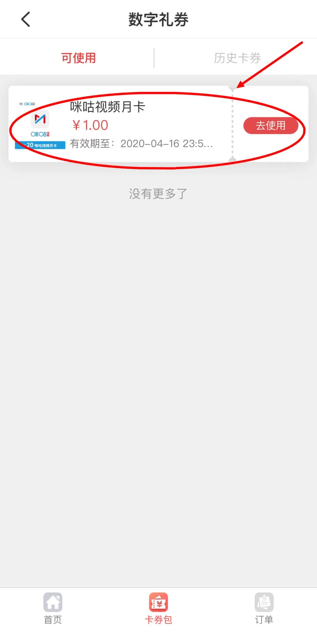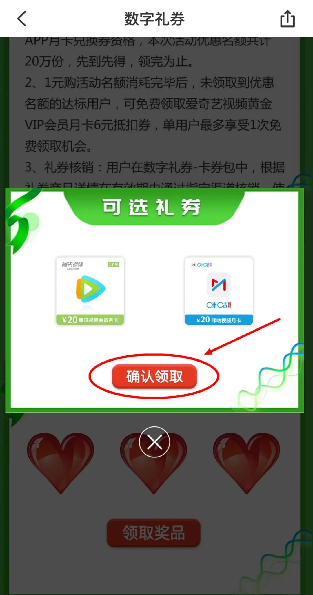 第三步:在【数字礼券】–【卡券包】中领取视频会员月卡兑换券。