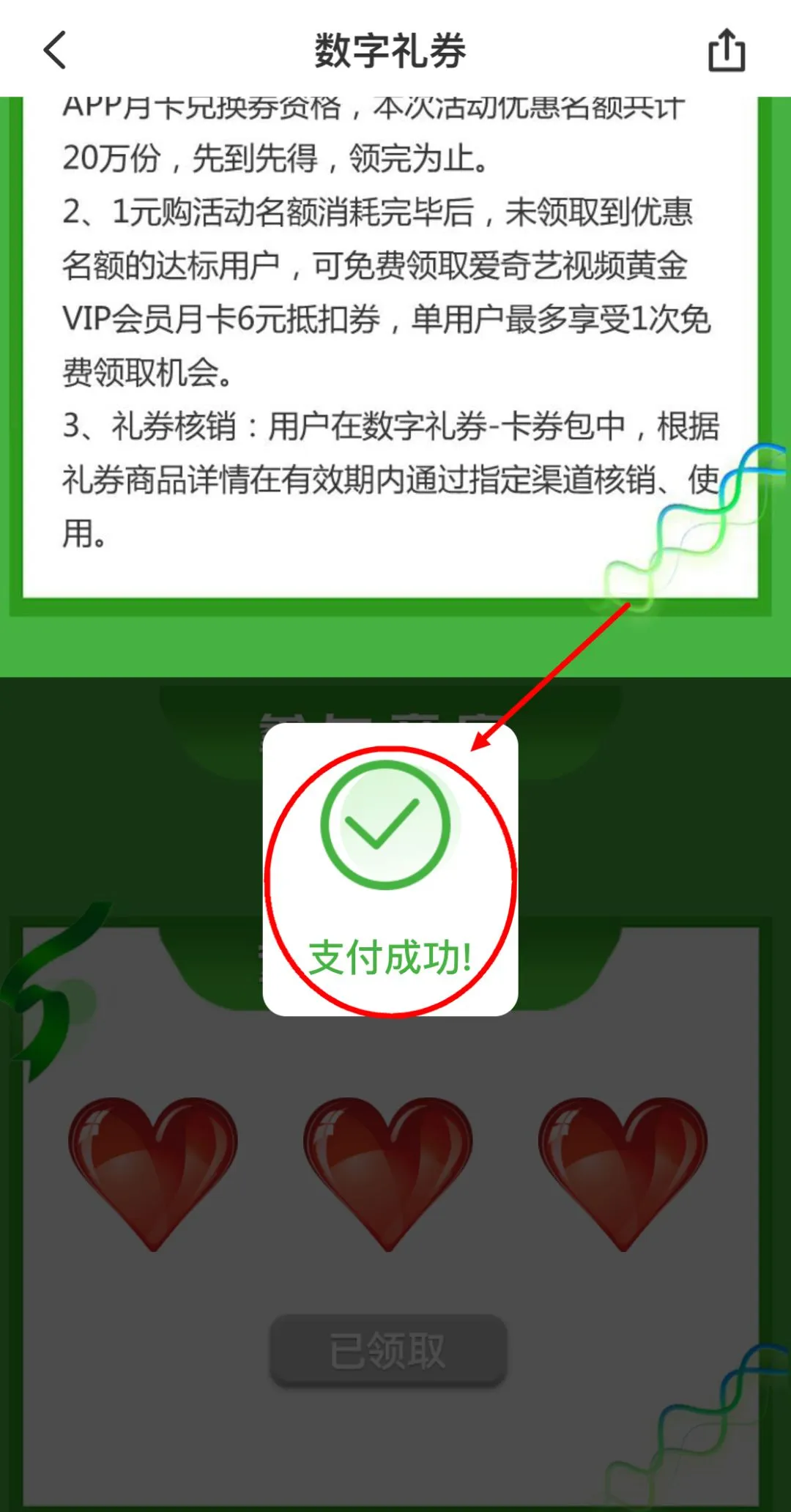 交易累计3笔的用户如果没有领到1元购活动名额,也不用灰心,还可免费领取爱奇艺视频黄金VIP会员月卡6元抵扣券,单用户最多享受1次免费领取机会。活动期间,名额无限量供应。