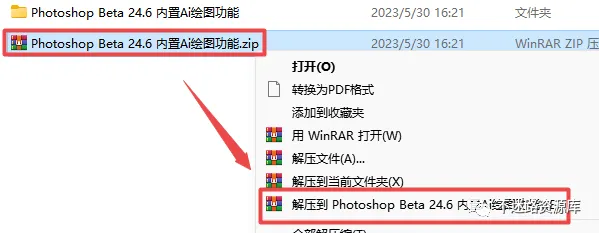 1.进入下载链接下载“Photoshop Beta 24.6 内置Ai绘图功能”安装包,选中下载的安装包,鼠标右键选择解压到“Photoshop Beta 24.6 内置Ai绘图功能”(没有解压选项点这里)