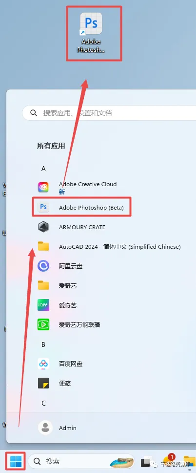 15.点击“开始“菜单栏,点击“所有应用“,找到“Adobe Photoshop (Beta)“软件,鼠标左键拖拽到桌面上即可创建桌面快捷方