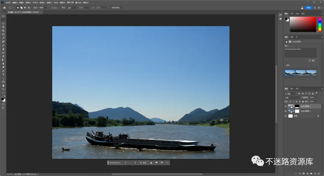 使用这一功能进行简单的创作,首先新建一个空白的画布,框选后输入:On the other side of the river, there are mountains and water, and it’s a sunny day(在河的另一边,有山有水,天气晴朗),稍等片刻,一幅图就生成了。