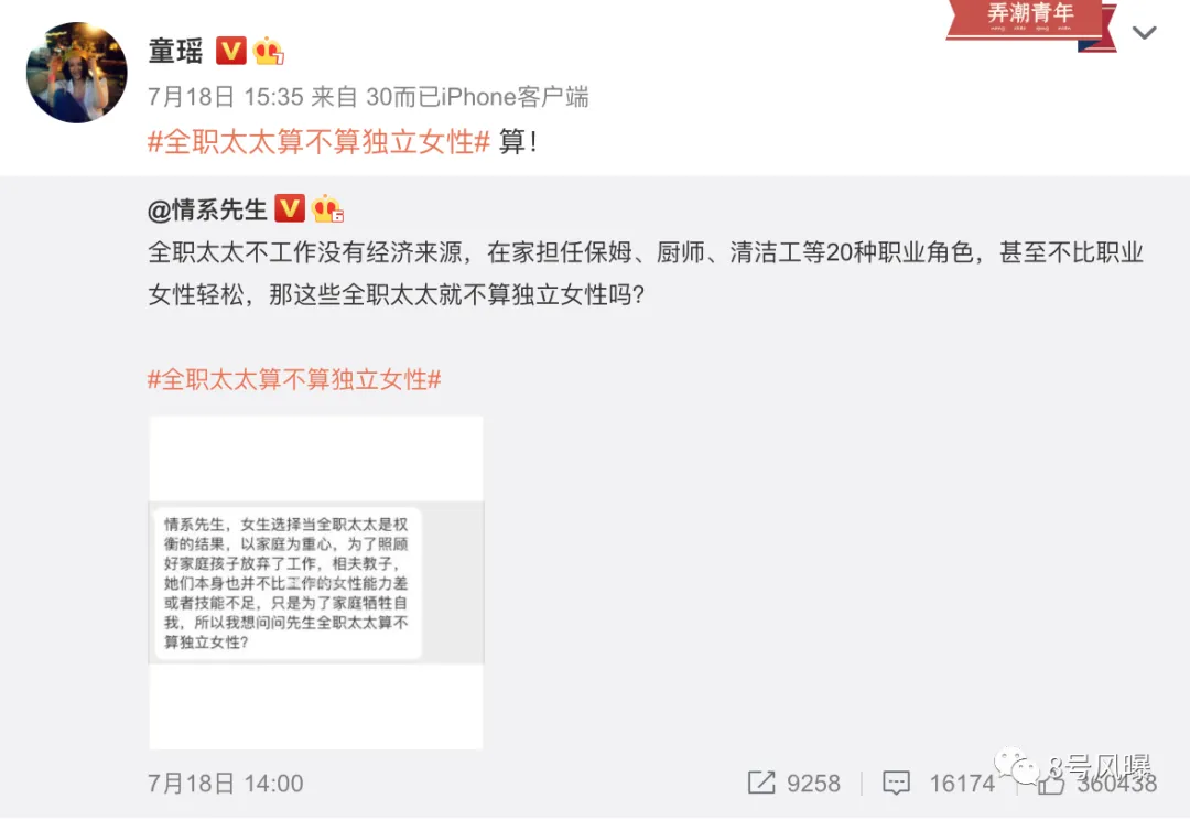 当顾佳还是许幻山背后的女人时,一句“全职太太算不算独立女性”便能轻易搅动网友们的辩论↓