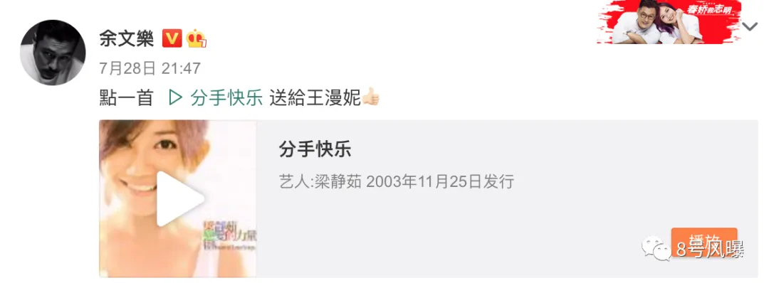 王漫妮和海王分手后,又是得到了余文乐点播的《分手快乐》↓