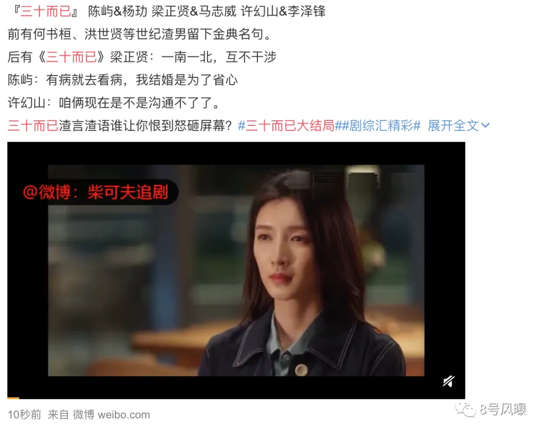 以《三十而已》为例,点进每个热搜词条,都是当天更新剧集的高潮时刻的图文或者短视频,短视频则一般时长在5分钟以下,内容怎么冲突就怎么来,怎么刺激就怎么来。
