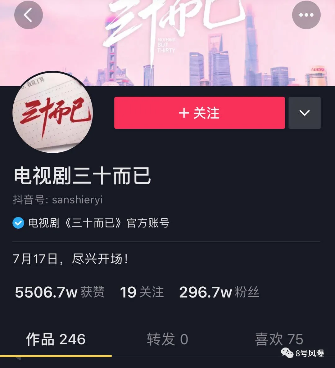 在抖音上,《三十而已》官博开播22天更新了246条作品,平均每天11条,共获得了超5500万点赞↓
