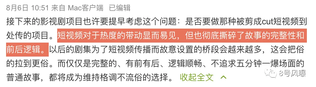 也有博主提出,通过短视频cut传播剧情高光时刻的做法,固然能够带来热度和观众,但会不会此后大家都如此效仿,故意设置能戳中嗨点的桥段呢?