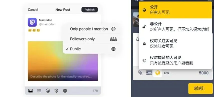 两个不同平台的嘟文可见性和字数限制示范   图片来源:joinmastodon.org、某第三方服务器