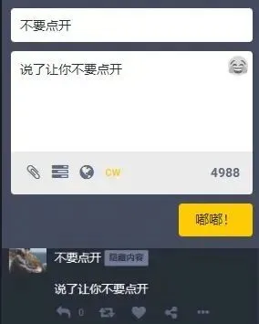 再比如,长毛象用户在发嘟文的时候可以添加一个“折叠按钮”(下图)。这个按钮可以作为内容警告(比如剧透警告),也可以在按钮里随便填写任何内容,并且可以搭配文字、图片、视频、音频等任何内容;而相比之下 Twitter 在今年2月才加入相似的“内容警告”(content warning) 功能,并且仅适用于图片和视频。