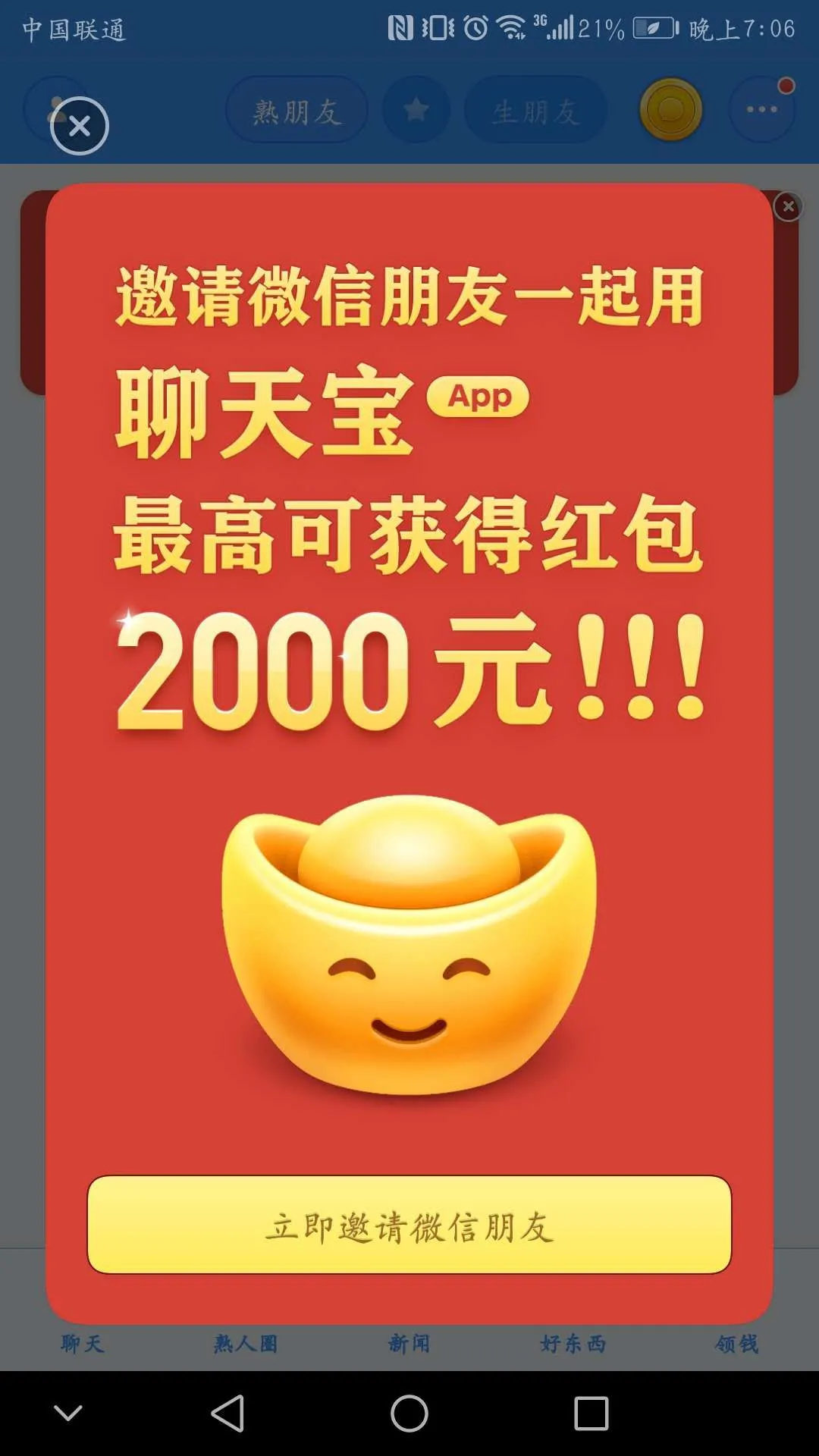 有网友在体验过“聊天宝”后表示,这款应用更像是一款“趣头条+拼多多+微信+子弹短信+头条”的大杂烩应用,首页界面下方共有5个tab图标,分别为聊天、熟人圈、新闻、好东西、领钱。聊天界面与原子弹短信界面类似,但模块设置变成了“熟朋友、星标朋友、生朋友”。