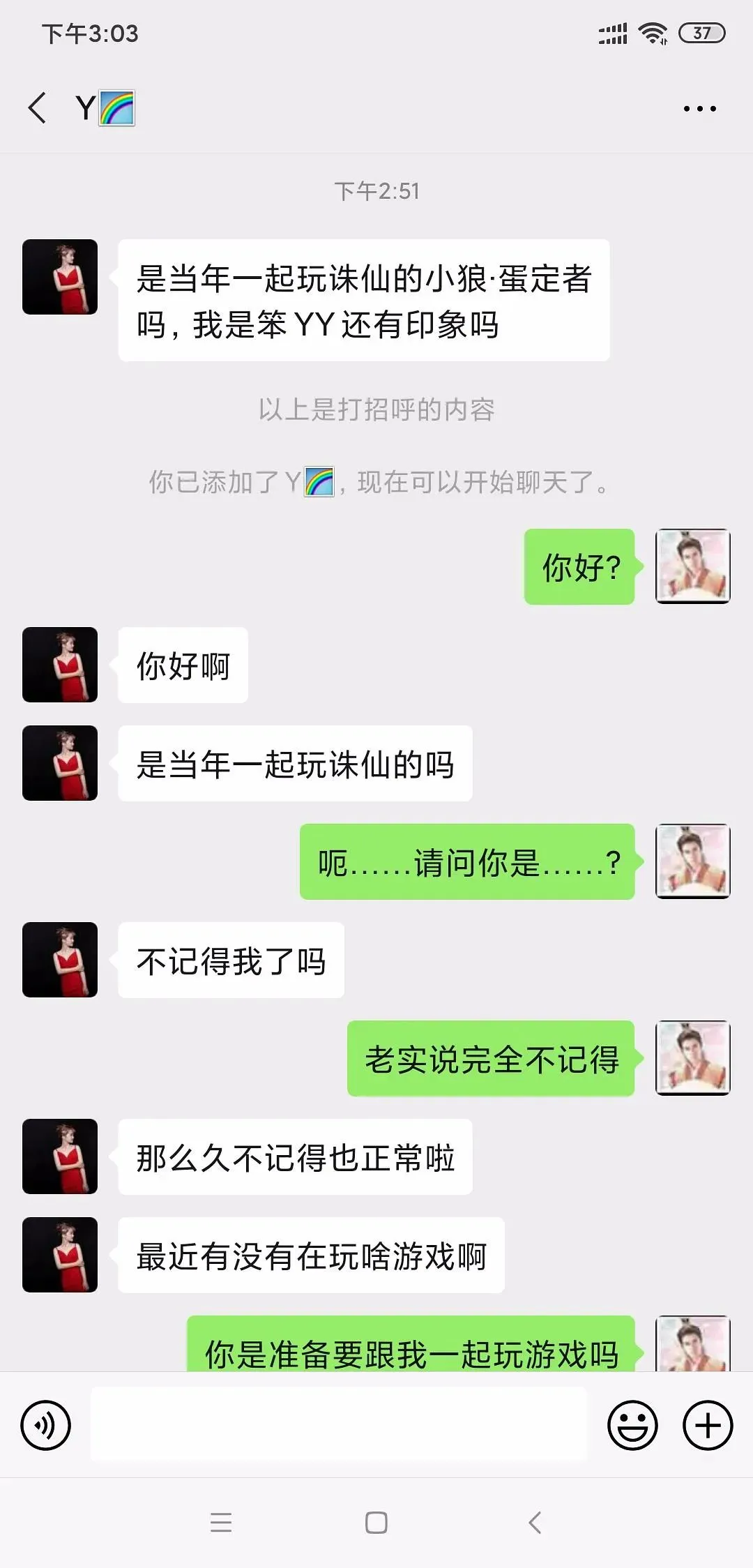 最近几天总是会有人加我,然后自称是以前玩XX游戏的好兄弟(我非常确定自己没玩过的),说话总是驴唇不对马嘴,让我觉得他们可能是聊天机器人一类的,于是决定用最常见的方式验证下,对方果然没回话了。