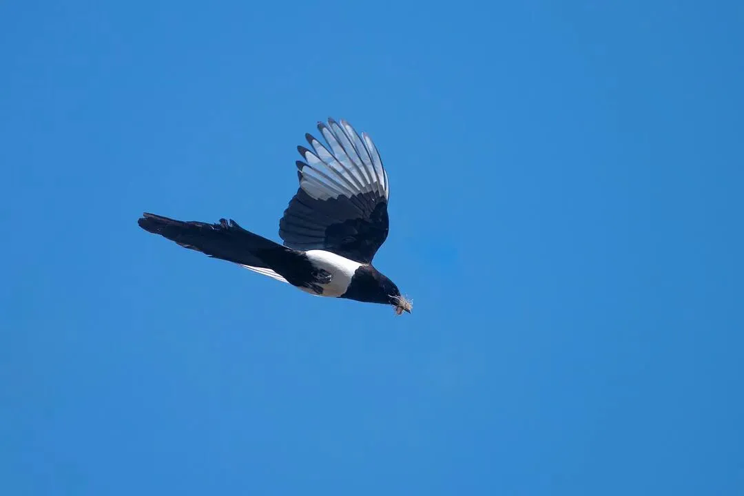 拍到一只衔草筑巢的喜鹊,翅膀在阳光下的层次可以产生很多联想