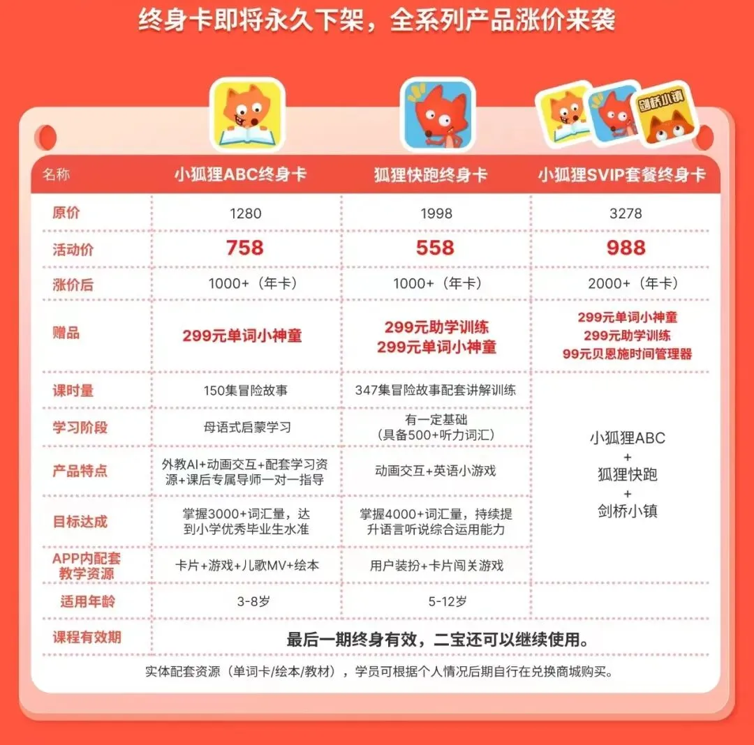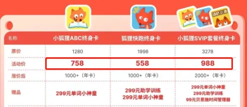 下图是涨价前后价格对比,以现在购买「狐狸快跑」的终身卡为例,原价1998元,咱们开团价格是558元,还送价值598赠品;涨价后1000元以上,只能买到年卡。