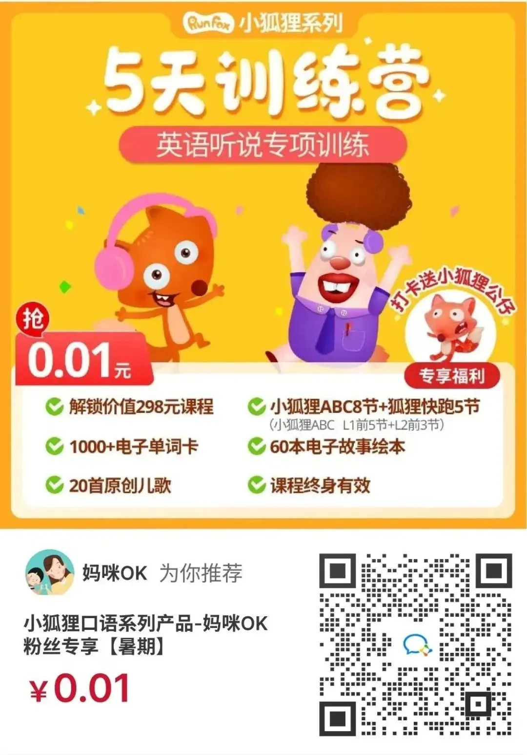 如果对孩子目前口语、听力水平不太有把握,也别急,我专门去争取来了0.01元的5天训练营,大家可以先进群。