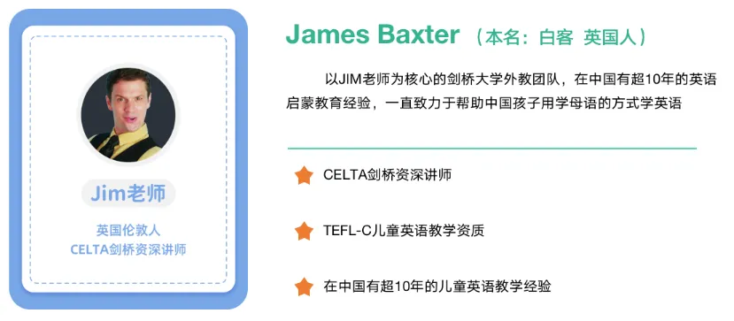 外教老师James Baxter ( Jim老师,有CELTA剑桥资深讲师、TEFL-C儿童英语教学资质),有点像憨豆先生,肢体语言和面部表情非常丰富,在中国已经有超10年英语启蒙教育经验,很懂咱们中国孩子在学英语时的痛点和难点。