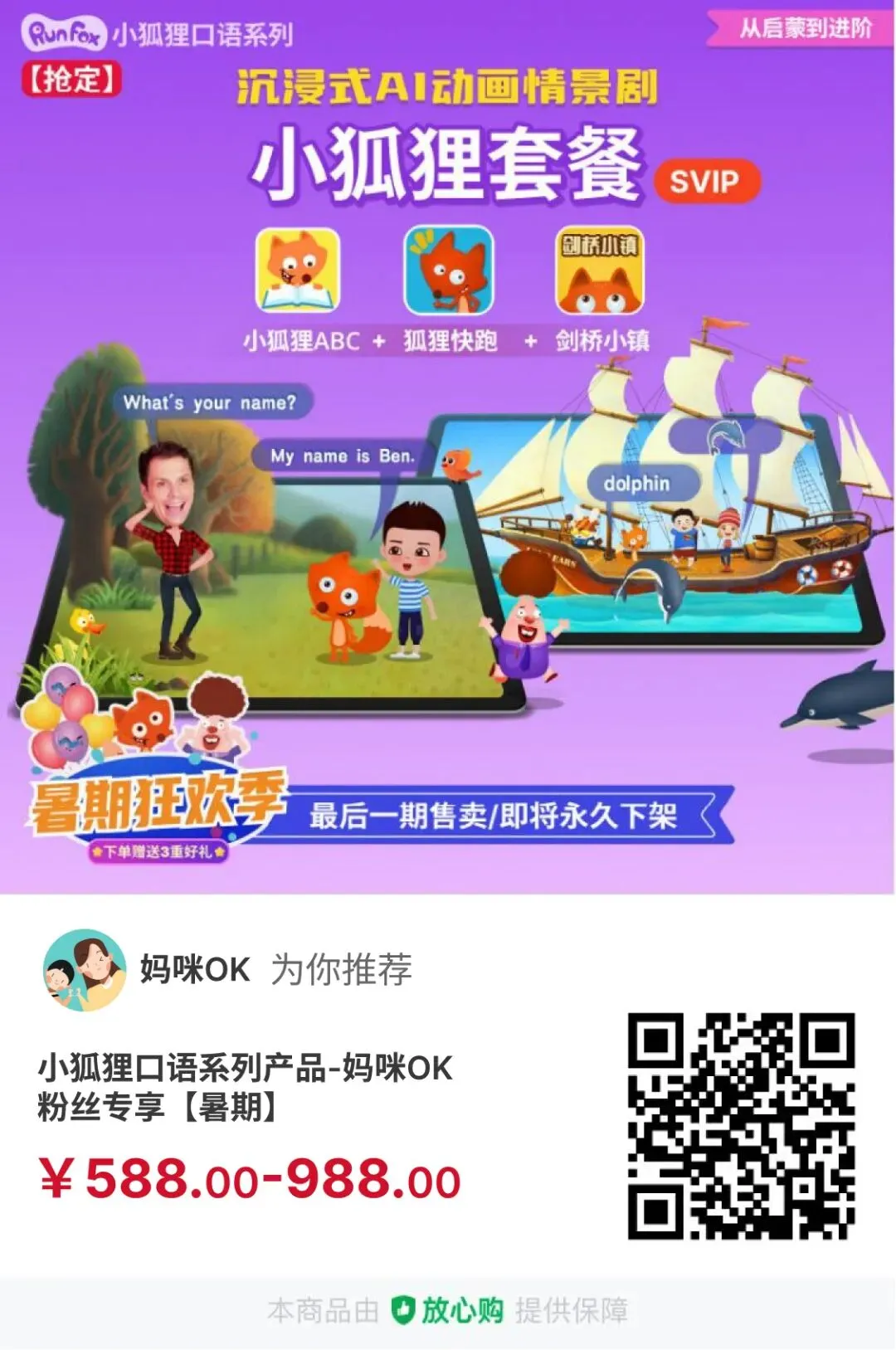 3-8岁英语基础薄弱的孩子:推荐爸妈们买988元的两款APP打包套餐,因为会再送同公司的剑桥小镇APP的永久使用权。
