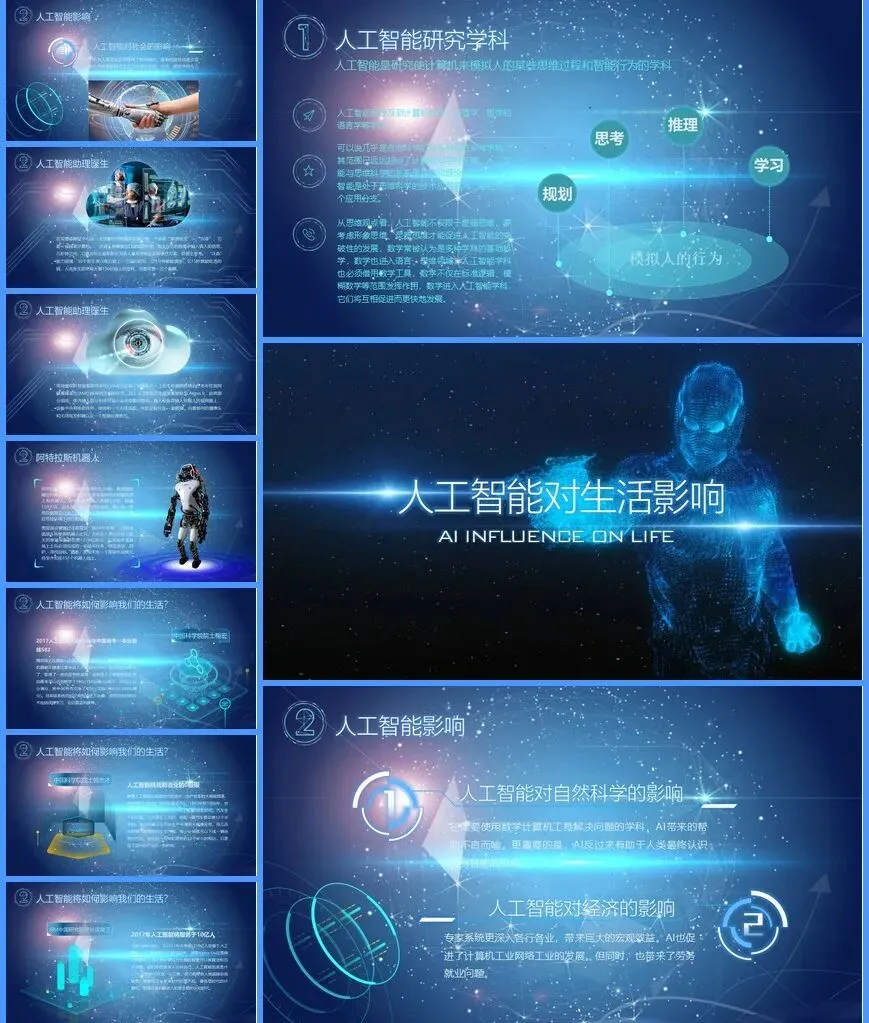 本合集包含21款人工智能主题演示文稿模板,涵盖多种视觉风格和适用场景。从星空背景到电路板纹理,从基础科普到前沿科技,满足不同受众的演示需求。