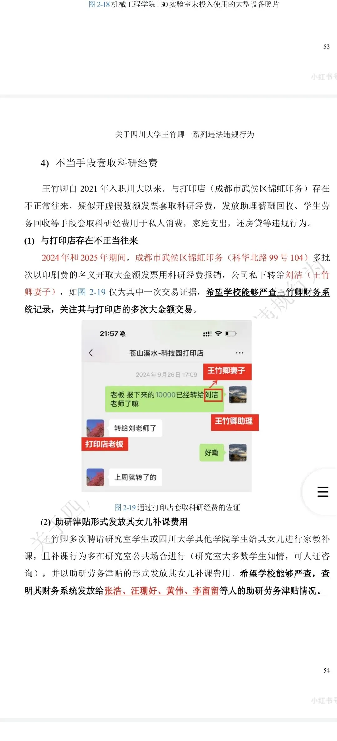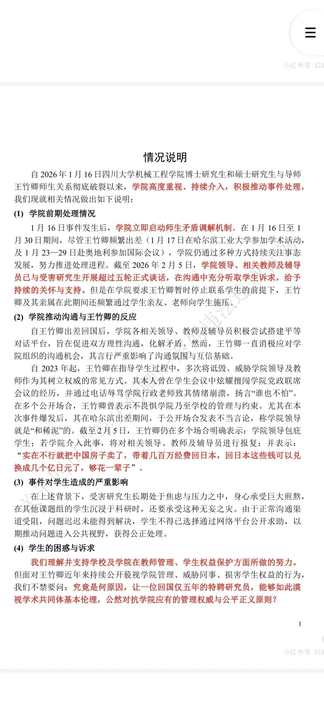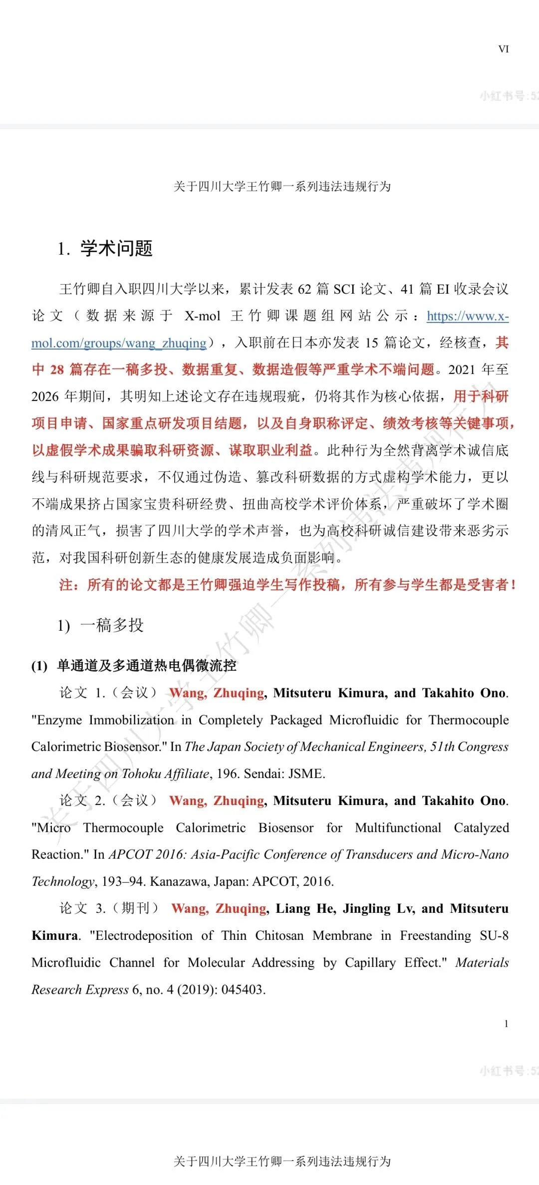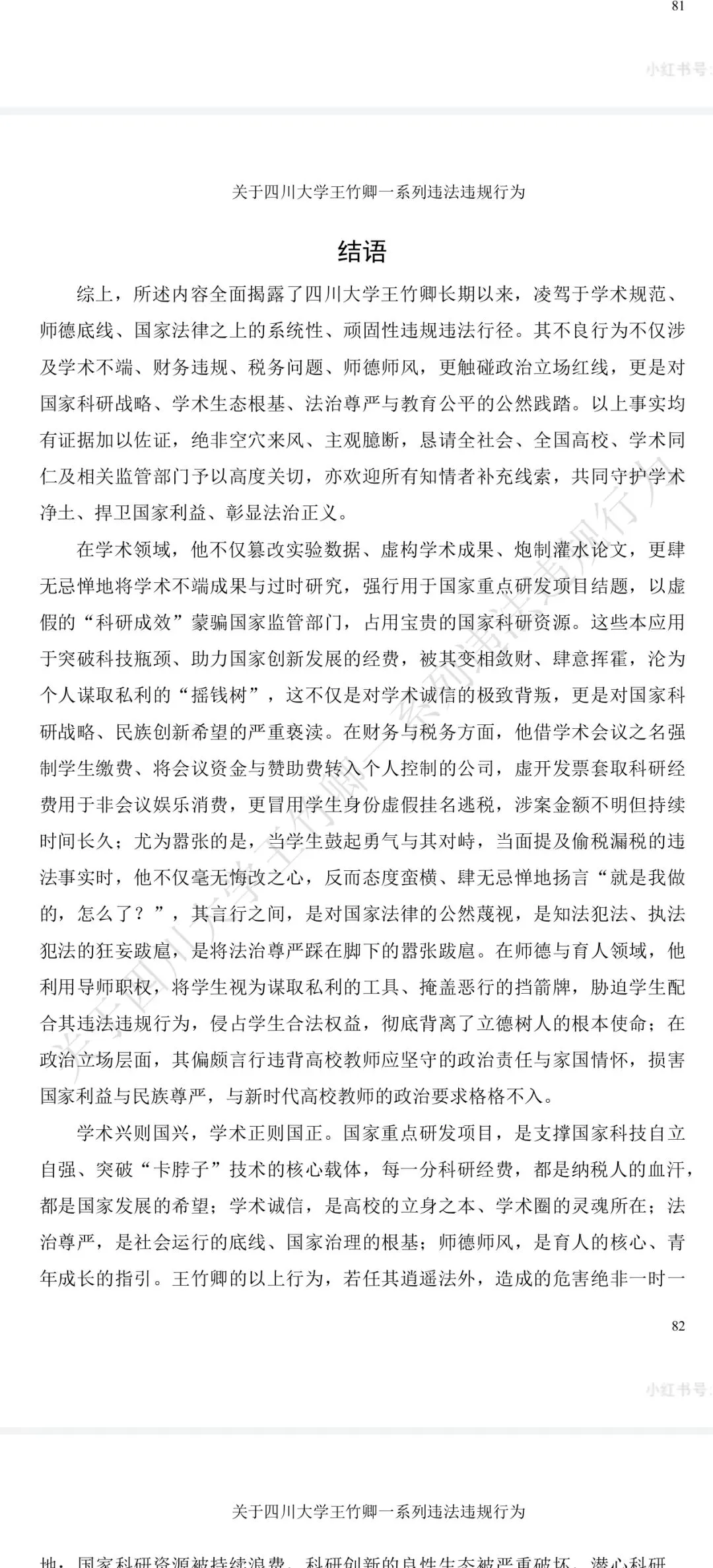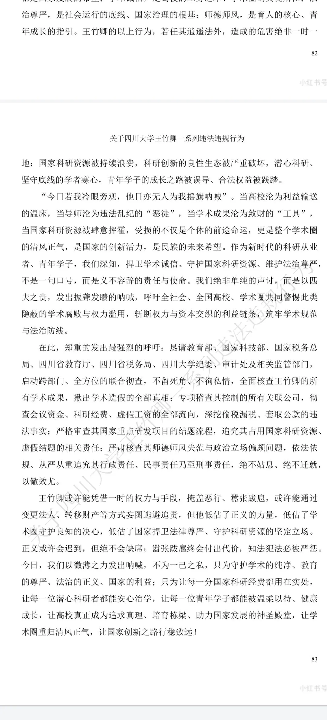 近日,四川大学某课题组多名在读硕博研究生联合举报王竹卿,