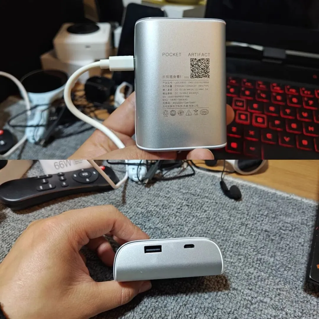 外观采用上玻璃下金属的双圆弧设计,没有棱角,手感还算温润,正面有乐视LOGO和电量、WiFi状态指示灯,背面印着绑定APP的二维码(现在已经没用了),侧边是开关机键、强制关机键和Micro USB输入、USB输出接口。三围是59.8mm×79.8mm×29.9mm,重量213g。但在当年,这个体积能塞下这么多功能,已经算不错的了。