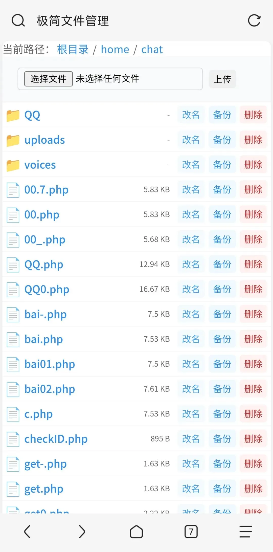 4. 文件上传:支持向当前目录上传任意文件,检测重名文件并阻止重复上传;