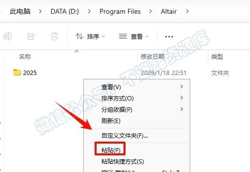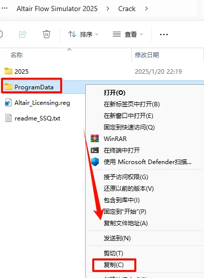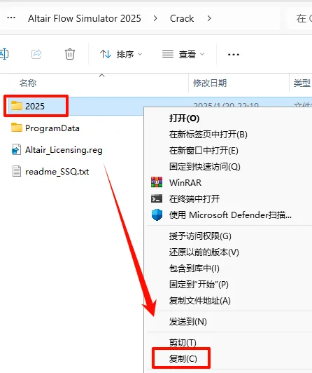 15.返回之前解压的“Altair Flow Simulator 2025“文件夹,打开“”文件夹,选中“2025“文件夹,鼠标右键选择“复制”