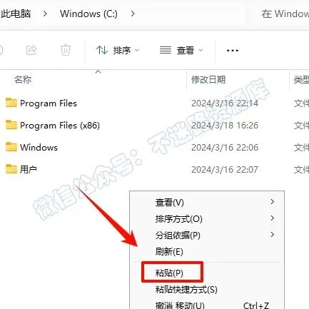 6.打开桌面“此电脑”,打开C盘根目录,粘贴刚刚复制的文件