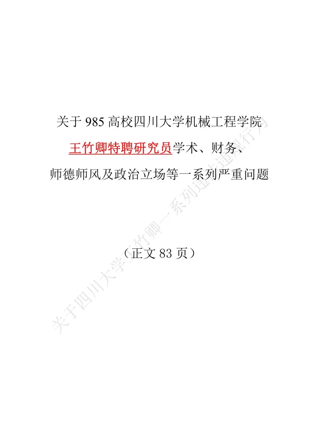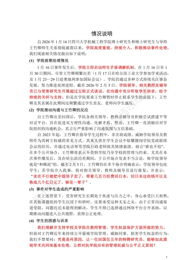 近日,四川大学机械工程学院特聘研究员、博士生导师王竹卿,被其课题组多名在读博士、硕士研究生联合举报,引发全网广泛关注。