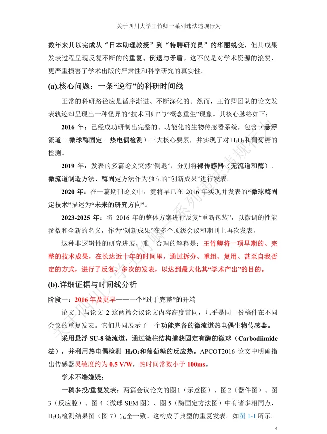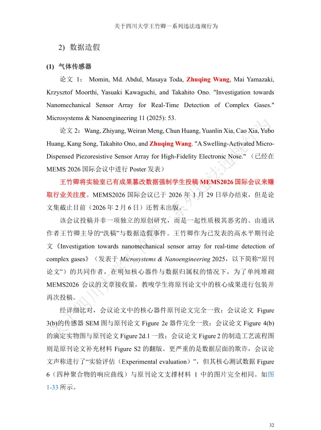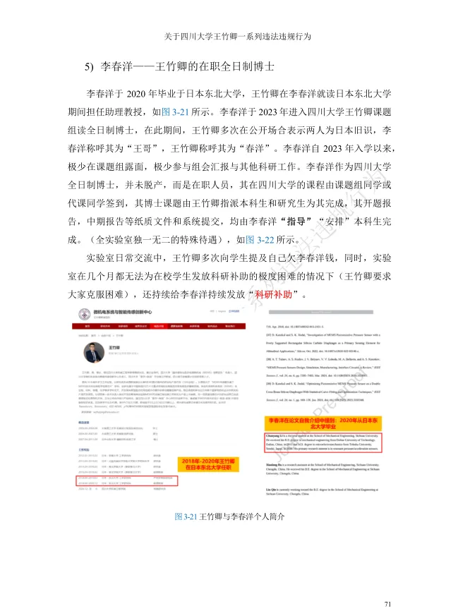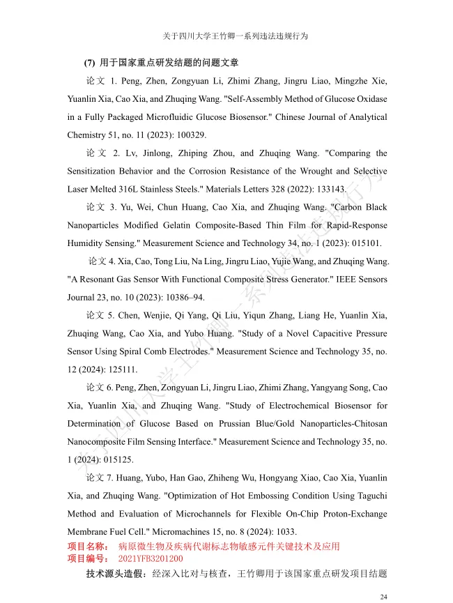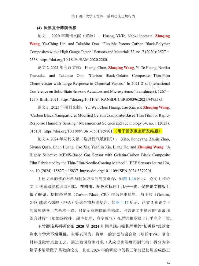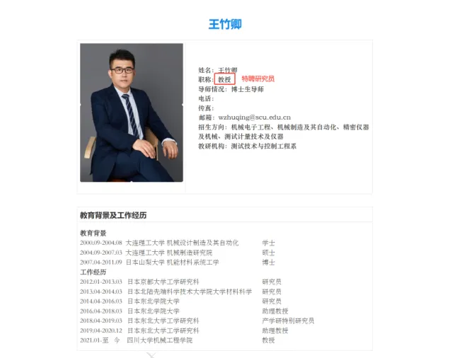 值得关注的是,被举报者王竹卿拥有光鲜的学术履历:本硕毕业于大连理工大学,2011年获日本山梨大学机能材料系统博士学位,2012-2020年在日本京都大学、东北大学等机构从事博士后研究与助理教授工作,归国后入职四川大学,头顶“四川省天府峨眉计划创新领军人才”“微机电系统与智能传感创新中心负责人”“四川大学‘医学+制造’平台独立PI教授”等光环,长期从事MEMS传感器及生物医学检测芯片研究,发表学术论文42篇,其中SCI论文35篇,主持多项国家级科研项目,曾是备受瞩目的海外引进学术人才。