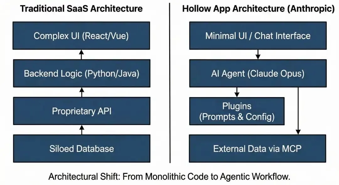 Anthropic 推出的插件系统揭示了一种全新的软件架构——“空心化应用”。传统的 SaaS 应用是“重”的,包含前端 UI、后端逻辑、数据库、鉴权系统等。而 Claude Cowork 的插件是“轻”的,甚至是“空心”的。