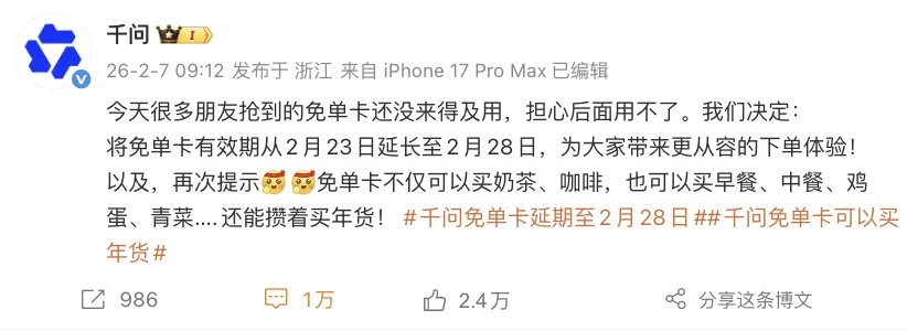 【前沿】千问App宣布免单卡有效期延长至2月28日