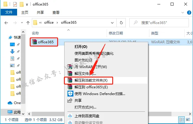 1.选中下载的office365软件安装包,鼠标右击选择【解压到当前文件夹】。