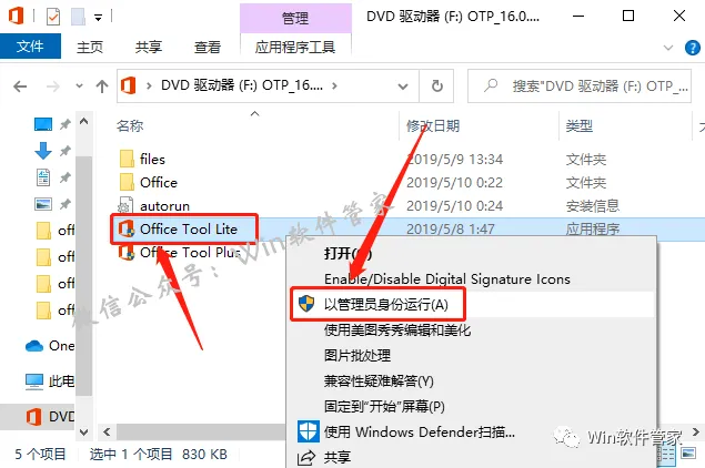 6.鼠标右击【Office Tool Lite】安装程序,选择【以管理员身份运行】。
