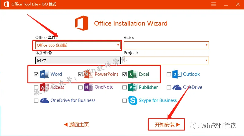 7.安装程序界面打开后,点击【office 套件】选项,这里的套件大家可以根据自己的喜好选择office的各个版本。然后下面根据自己需求,选择产品,助手这里只选择了Word、Excel、PPT,选择好后点击【开始安装】。