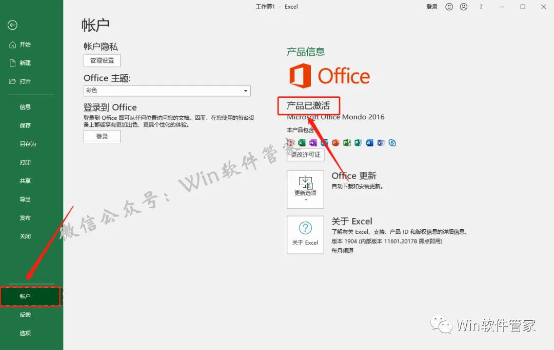20.点击【账户】,这是可以在右侧看到【产品已激活】,那么我们的office软件激活成功。如果没有激活,那么久使用激活工具多查实几次,关机重启激活再激活。