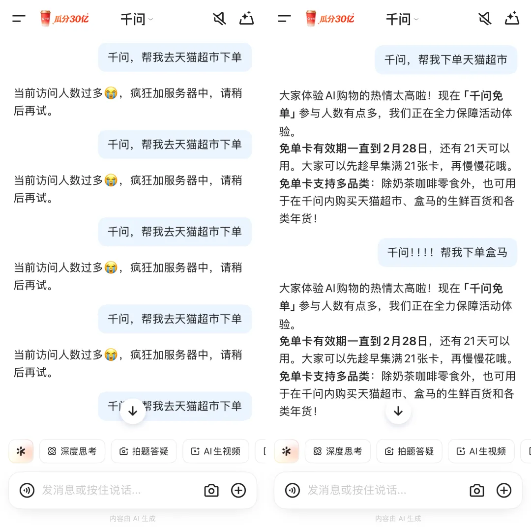 昨日,阿里旗下的AI应用——千问App“春节30亿元请客计划”正式开启,以免单形式覆盖淘宝、闪购、飞猪、大麦、高德、盒马等用户吃喝玩乐消费,用户下载登录后即可领取一张25元无门槛免单卡,输入口令让千问点奶茶咖啡或者外卖,再授权淘宝闪购支付即可最低1分钱下单成功。但从昨日10:30左右开始,千问一直处于火爆状态,今日许多用户反馈依旧无法下单。