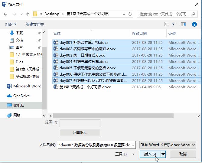 Step 03 找到Word文档的存放位置,按住Shift键选择第一个Word文档跟最后一个Word文档,这样就将所有Word文档选中,单击插入。