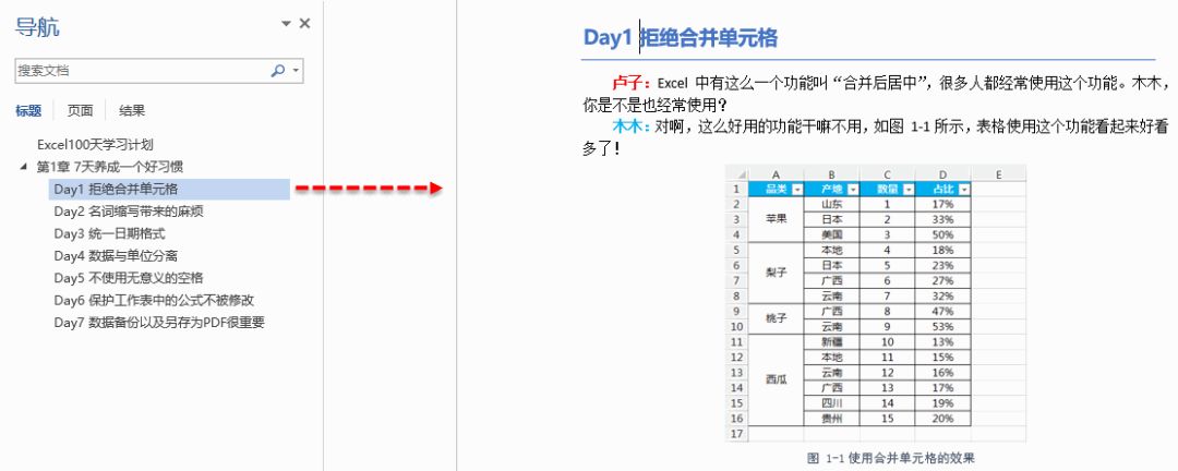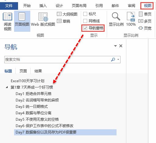 Step 01 单击视图,勾选导航窗格,就可以看到每一小节的目录。
