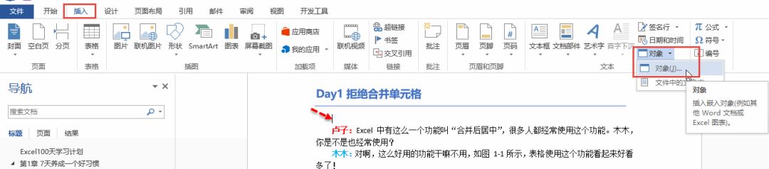 Step 01 在小节标题下面,增加一行,单击插入→对象→对象。