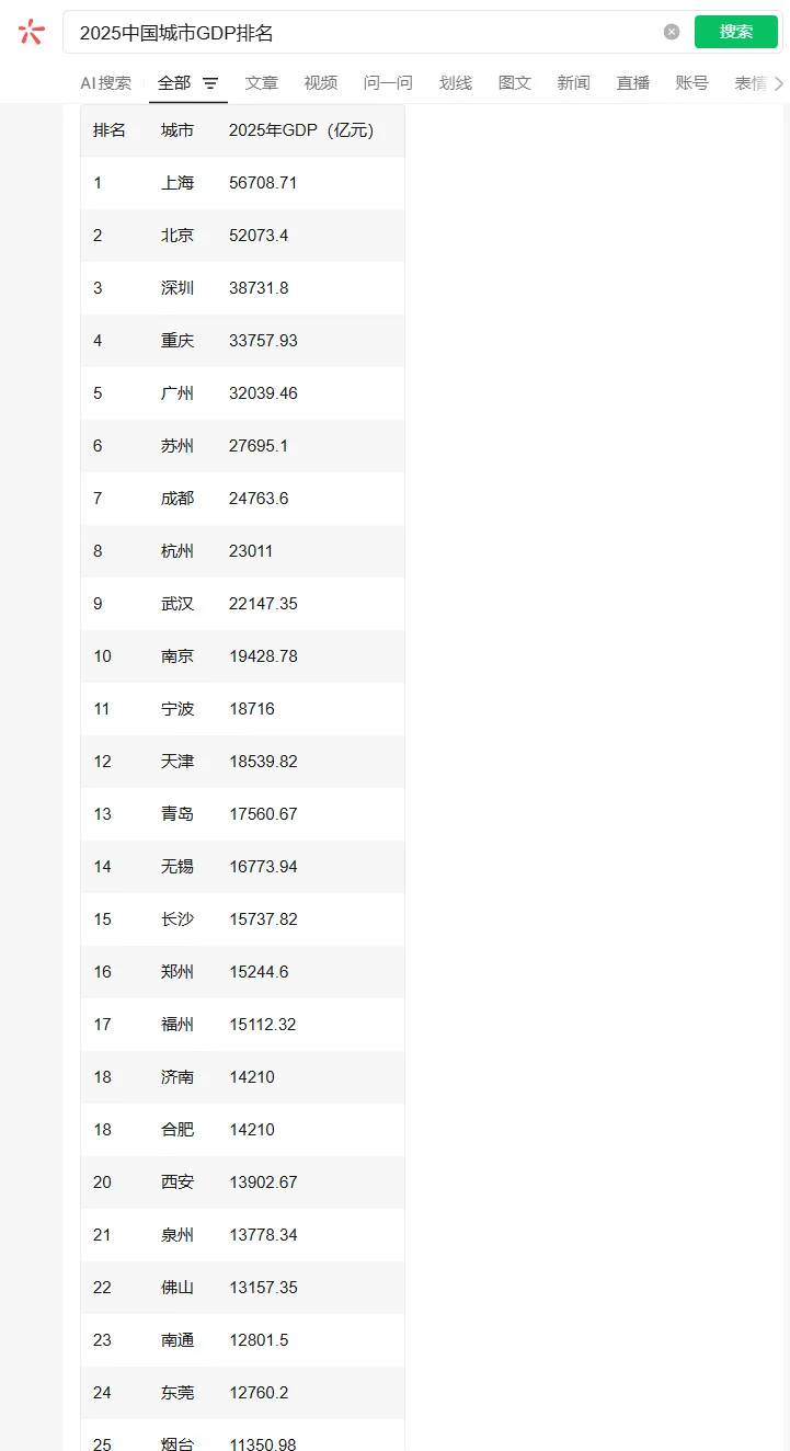 领到红包,我边喝着阿里千问发的奶茶,正好想查询一个问题:2025年中国城市GDP排名