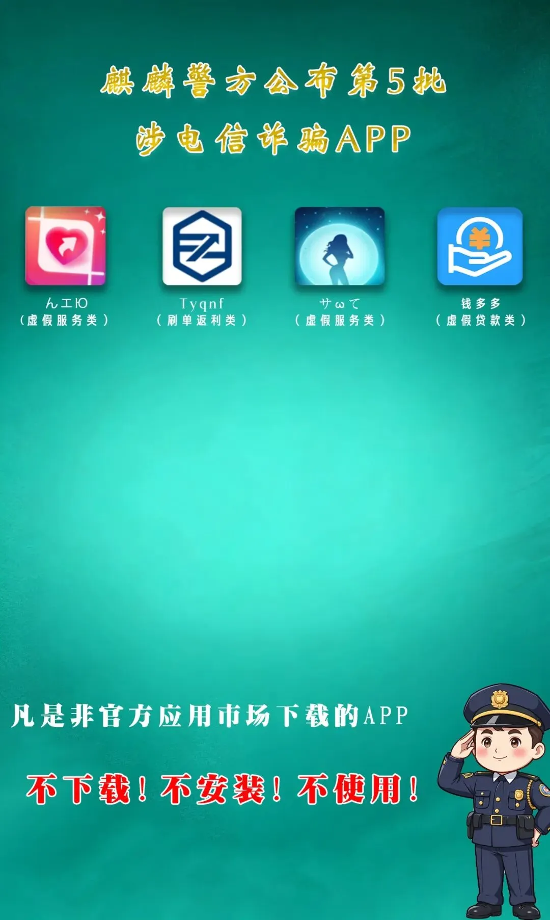 电信网络诈骗套路持续迭代翻新,涉诈APP常披着各类迷惑性“马甲”招摇撞骗,悄悄布设诈骗陷阱。为切实守护辖区群众的“钱袋子”,麒麟警方每周梳理辖区内已成案的涉诈APP,特此曝光黑名单,助力大家练就反诈“火眼金睛”,精准识破诈骗迷局。