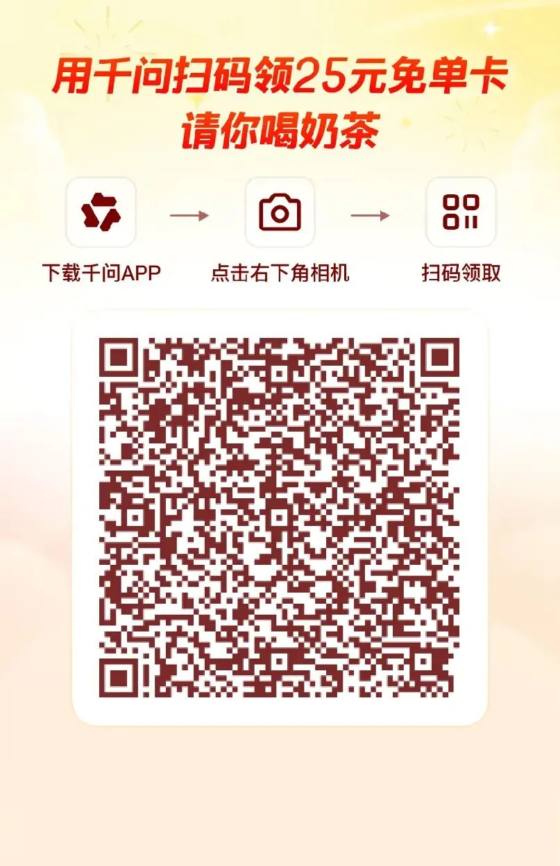 所有用户先更新千问APP到最新版,打开后都能白拿一张25元无门槛免单卡,不仅能免单喝奶茶,也能通过淘宝闪购买年货、点外卖。